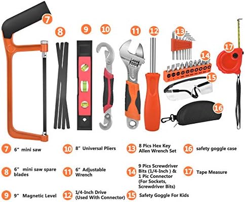 🛠️ Extra durable child tool set: Including 1×6” Flat Nose Pliers, 1×6” Claw Hammer, 1×6.7” Long Nose Pliers, 1×6″ Mini Saw with spare blades, 1×9” Magnetic Level, 1×8” Universal Pliers, 2×8” Magnetic Screwdriver, 1×6” Adjustable Wrench, 1×1/4-Inch Drive(Used With Connector),9 Pics Sockets(1/4-Inch),8 Pics Hex Key Allen Wrench Set,9 Pics Screwdriver Bits (1/4-Inch)&1 Pic Connector,1x Safety Goggle For Kids, 1x Tape Measure, 1x handy childrens tool box and 1x adjustable Tool belt.